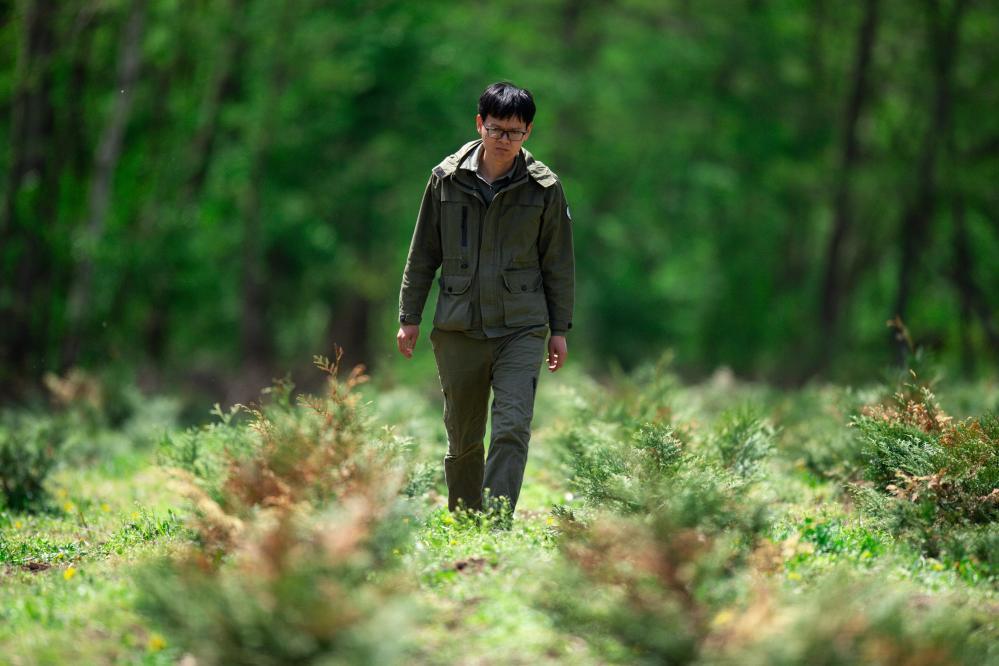 5月9日,贾翔在长白山科学研究院育苗基地检查朝鲜崖柏的生长情况。新华社记者 许畅 摄