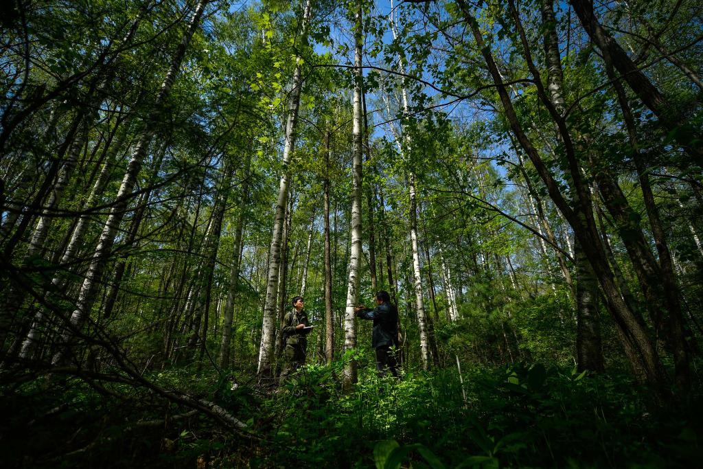 5月9日,贾翔(左)和工作人员赵路福在长白山国家级自然保护区的植物固定监测样地测量记录树木生长数据。新华社记者 许畅 摄