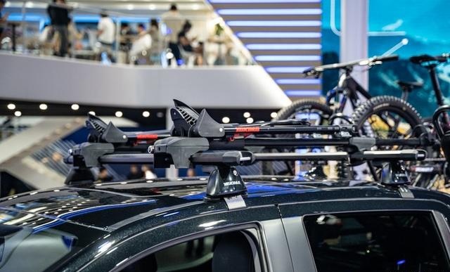 福特游骑侠Ranger展车,安装了全套来自北美YAKIMA车架品牌产品,车顶、货箱上方、拖挂方口,均安装了搭载自行车的车架,最大可运载7辆自行车。而且货箱内部空间也没有浪费,可放置自行车维修工具,展示出皮卡作为自行车后勤保障车的多元玩法。