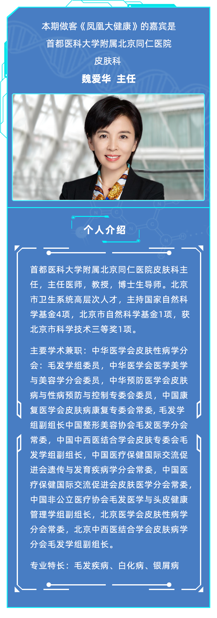 本期做客《凤凰大健康》的嘉宾是首都医科大学附属北京同仁医院皮肤科主任魏爱华