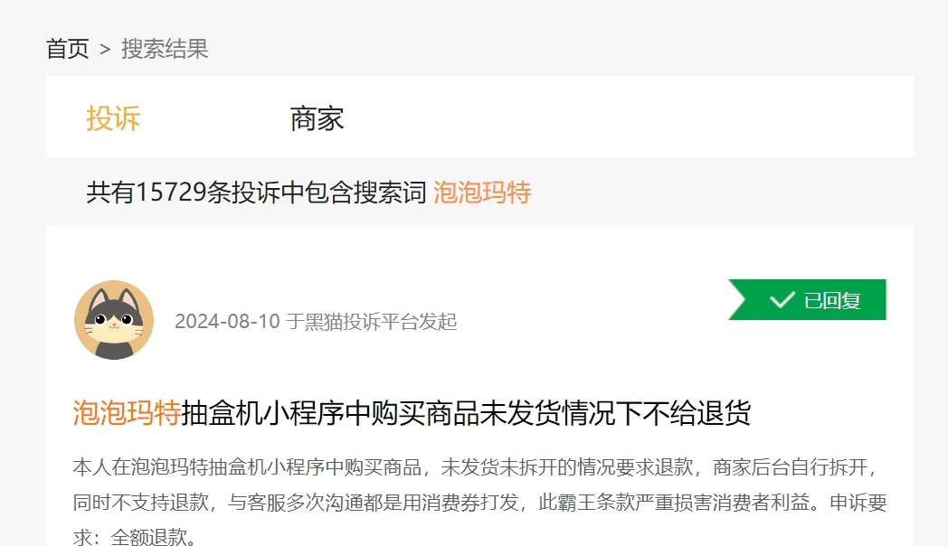 《5D调查》发现,截至8月29日,黑猫平台针对泡泡玛特的投诉数量高达15729件,近30天投诉解决率不足8%,投诉理由主要为质量问题、退款纠纷。