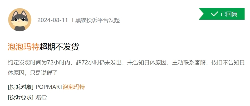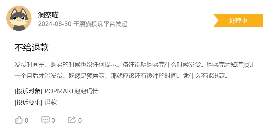 DoNews8月30日消息,据《5D调查》报道,近日在黑猫投诉平台发现,有消费者投诉泡泡玛特“不发货不退款”,以及产品有瑕疵但售后不作为的问题。