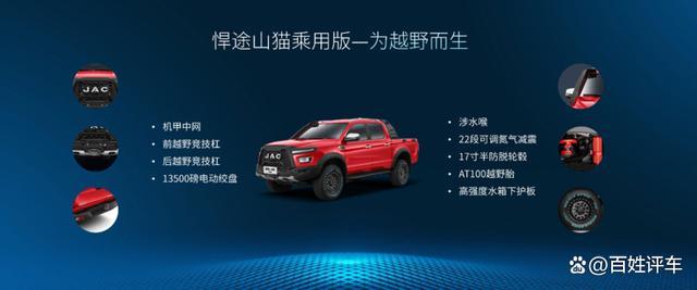 全新悍途乘用版重新定义皮卡,赋予多元价值,更适合家庭使用,将点燃更多人心中的皮卡梦!未来,江淮皮卡将坚定“商乘并举,油电并进,国内国际双轮驱动”的发展战略,加快全球化、乘用化、智能化、场景化、新能源化转型升级,做华系皮卡的新名片、全球皮卡的新标杆。