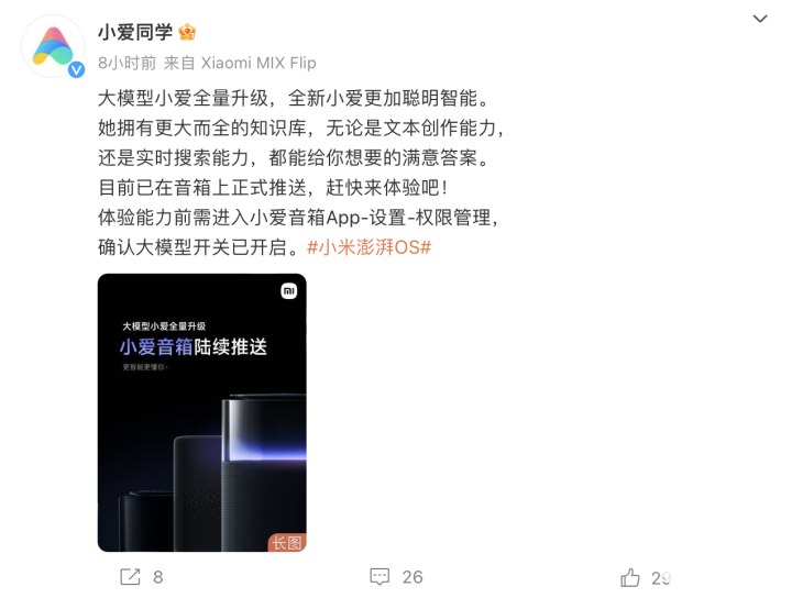 目前,小米「大模型小爱」已经在小米Sound Pro、Sound Move、Sound音箱以及若干款小爱音箱中上线;十月内还会陆续覆盖更多的小爱音箱以及智能屏产品,让小爱同学更聪明、更好用。