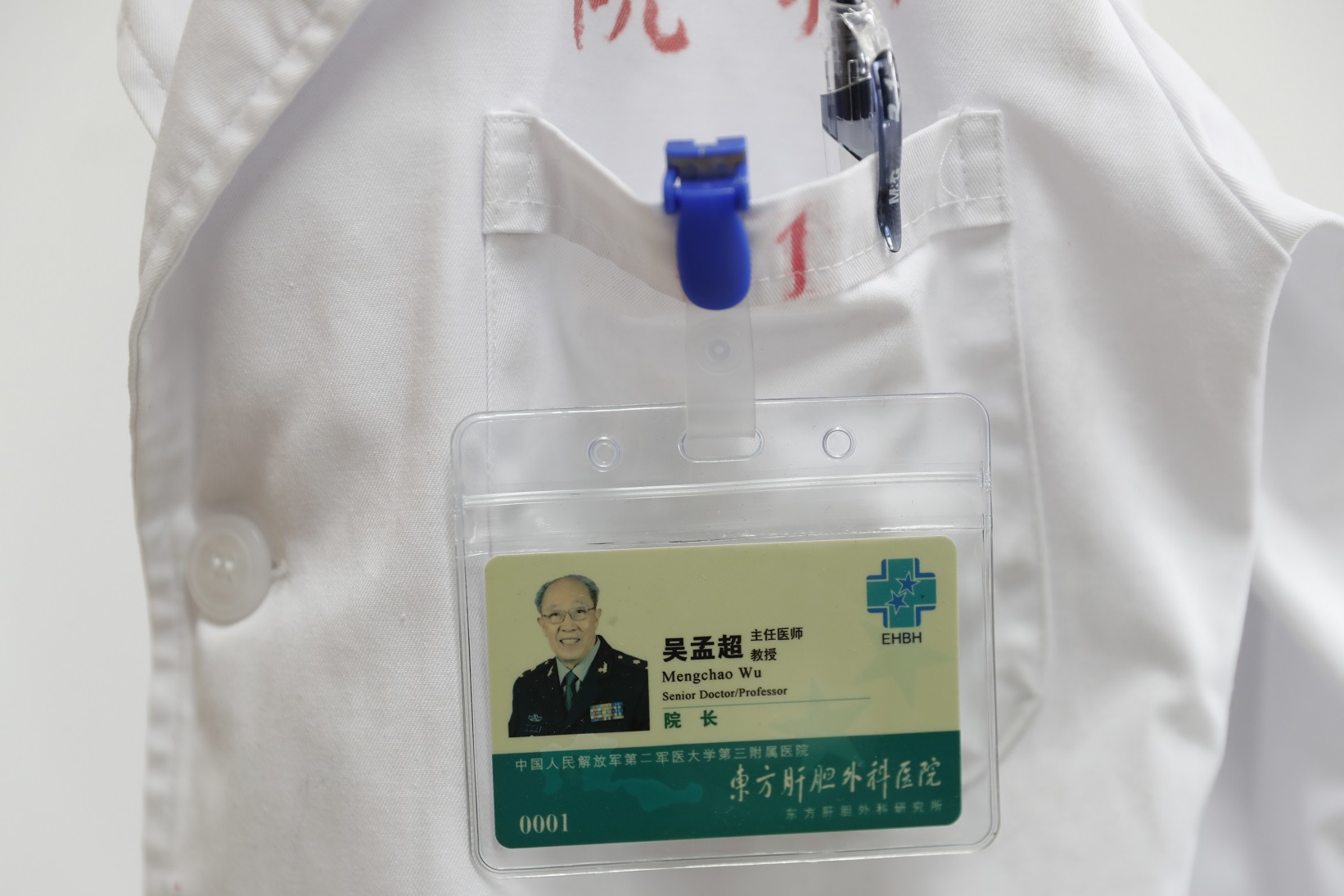 走进办公室,办公桌上的日历定格在了2021年5月22日,这一天吴孟超永远离开了我们。一旁的衣架上还挂着他生前所穿的白大褂,衣襟上板正地别着一枚党徽,党徽正下方夹着一个胸牌:“东方肝胆外科医院,0001号,吴孟超|主任医师、教授、院长。”