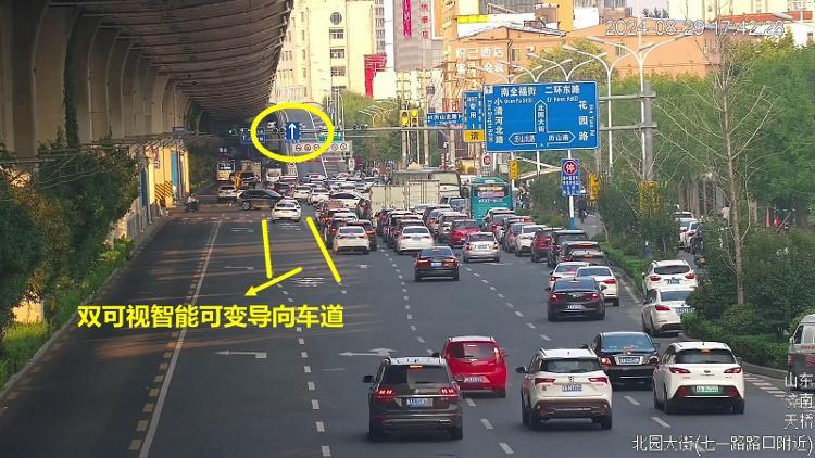 近期,有网友发现,在济南市北园大街历山路路口西口实现了双可视智能可变导向车道。