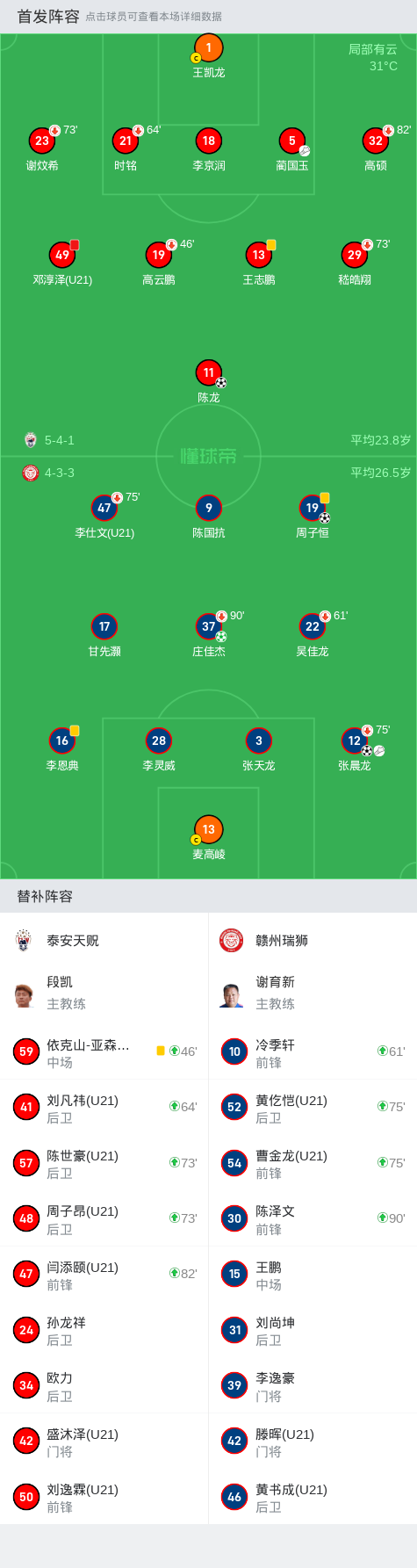 北京时间8月31日,中国足球乙级联赛决赛阶段第21轮,泰安天贶主场迎战赣州瑞狮。比赛中,赣州瑞狮的张晨龙助攻周子恒率先破门。随后,泰安天贶的蔺国玉助攻陈龙扳平比分。然而,赣州瑞狮的庄佳杰通过点球再次将比分超出,并且张晨龙再度建功,扩大了领先优势。比赛接近尾声时,泰安天贶的邓淳泽被罚下场。最终,赣州瑞狮以3比1战胜泰安天贶。