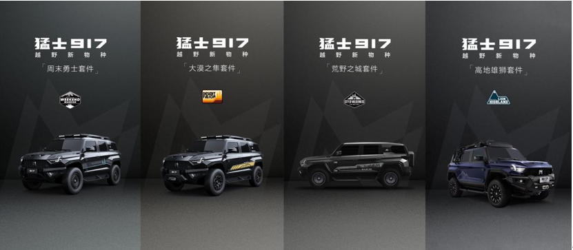 为野奢露营,东风猛士科技打造了周末勇士套装。为大漠冲沙,东风猛士科技推出了大漠之隼套装。为轻度越野,东风猛士科技开发了荒野之城套装。为重度越野,东风猛士科技定制了高地雄狮套装。