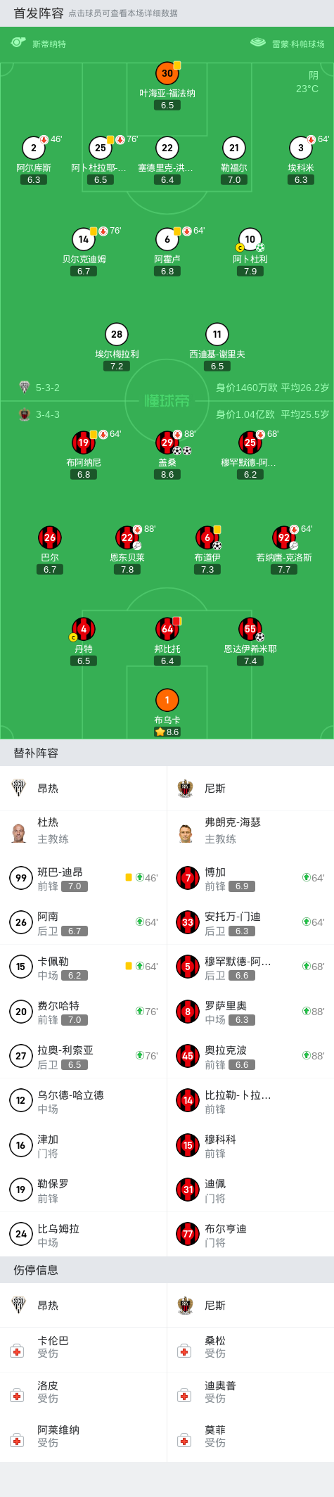 第72分钟,尼斯球员博加助攻盖桑打入一球。