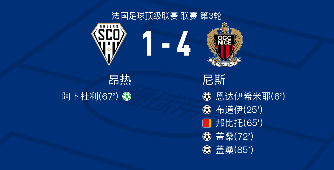在法国足球顶级联赛第3轮的比赛中,昂热主场迎战尼斯。比赛一开始,尼斯的若纳唐-克洛斯助攻恩达伊希米耶,率先打破僵局。随后,恩东贝莱为布道伊送出助攻,布道伊再下一城。比赛进行到中段,尼斯的邦比托因累计两张黄牌被罚下场。昂热的阿卜杜利抓住机会,通过点球为球队扳回一城。然而,尼斯并未因此退缩,博加助攻盖桑,再次扩大比分。比赛接近尾声时,盖桑再度破门,完成梅开二度。最终,昂热以1-4不敌尼斯。