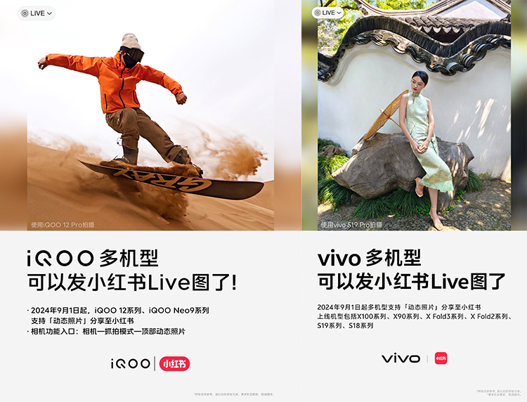 在小红书平台发布Live动态图片一直都是iPhone独享的功能。在今年5月份时,OPPO旗下机型Reno12系列宣布成为首款能够发布实况照片的安卓手机。而如今,vivo与iQOO旗下多款手机都宣布支持在小红书上发布Live动态图片。