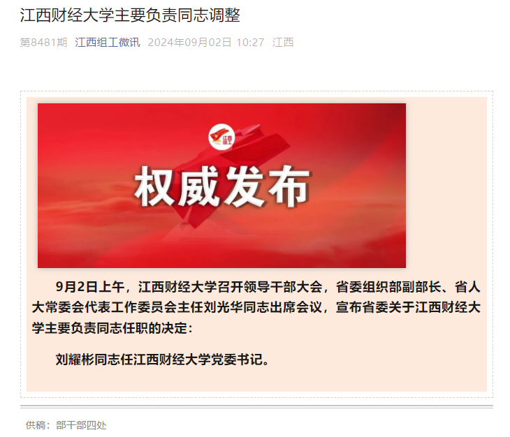 据江西组工微讯:9月2日上午,江西财经大学召开领导干部大会,省委组织部副部长、省人大常委会代表工作委员会主任刘光华同志出席会议,宣布省委关于江西财经大学主要负责同志任职的决定: