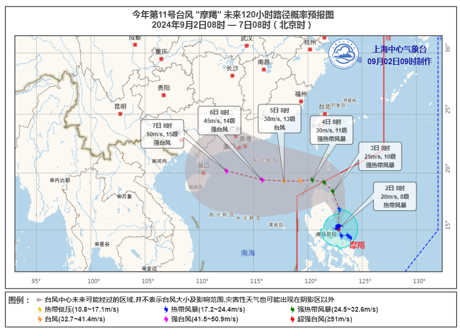 此外,今年第11号台风“摩羯”已于昨天(9月1日)晚上生成,今天08时位于距离菲律宾马尼拉东偏北方向约205公里的太平洋洋面上,强度维持热带风暴级。预计“摩羯”将以每小时15-20公里的速度向偏北方向移动,强度逐渐加强,3日开始转向西偏北方向移动,并将于5日前后进入南海北部海面,最强可达强台风级或超强台风级。 “摩羯”主要影响华南地区,对上海无直接影响。