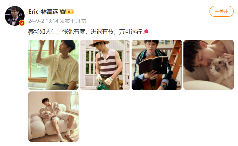 9月2日,国乒选手林高远更新个人微博晒出男友风时尚大片,并配文“赛场如人生,张弛有度,进退有节,方可远行”。