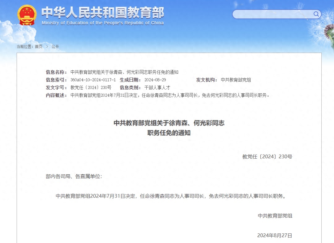 据教育部网站消息,中共教育部党组2024年8月27日决定,任命徐青森同志为人事司司长,免去何光彩同志的人事司司长职务。此前,在今年6月,何光彩已任教育部副部长。