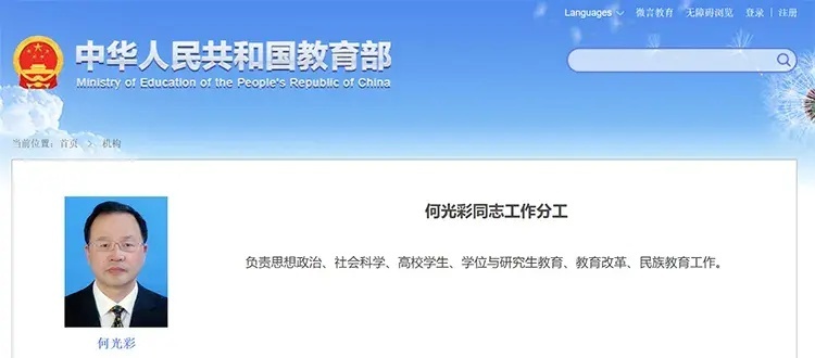 近日,教育部网站“教育部领导”栏目更新显示,今年6月最新任命的教育部副部长何光彩,负责思想政治、社会科学、高校学生、学位与研究生教育、教育改革、民族教育工作。