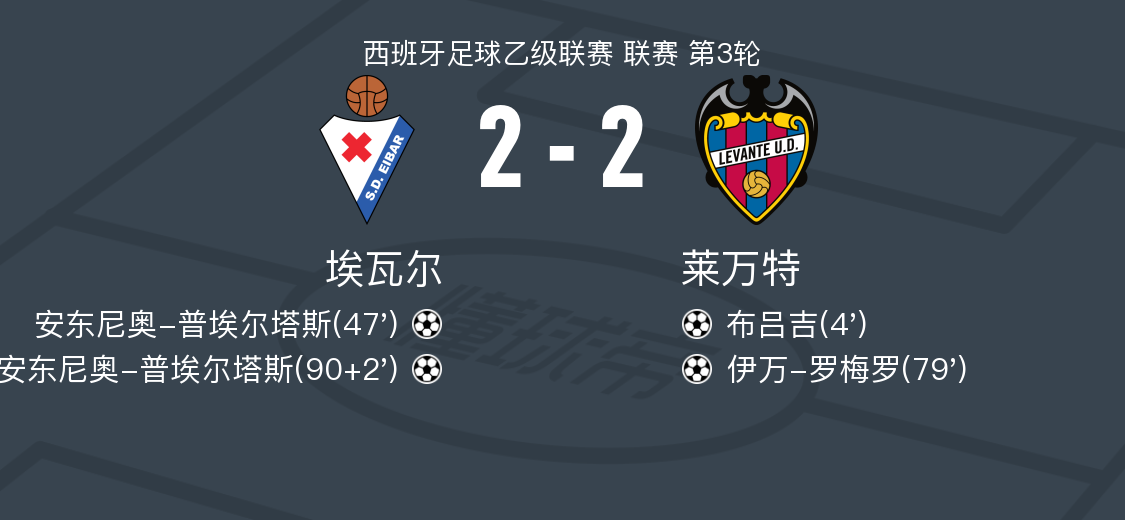 北京时间9月3日西班牙足球乙级联赛 联赛 第3轮,埃瓦尔主场对阵莱万特。埃瓦尔安东尼奥-普埃尔塔斯梅开二度。莱万特布吕吉破门,伊万-罗梅罗破门。最终比分埃瓦尔 2-2 莱万特。