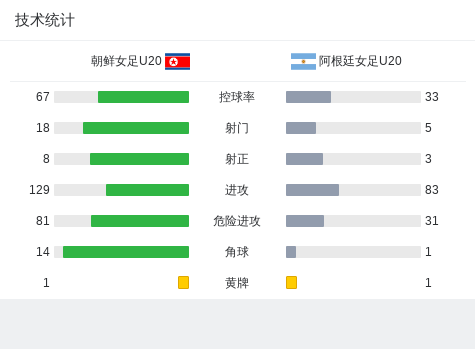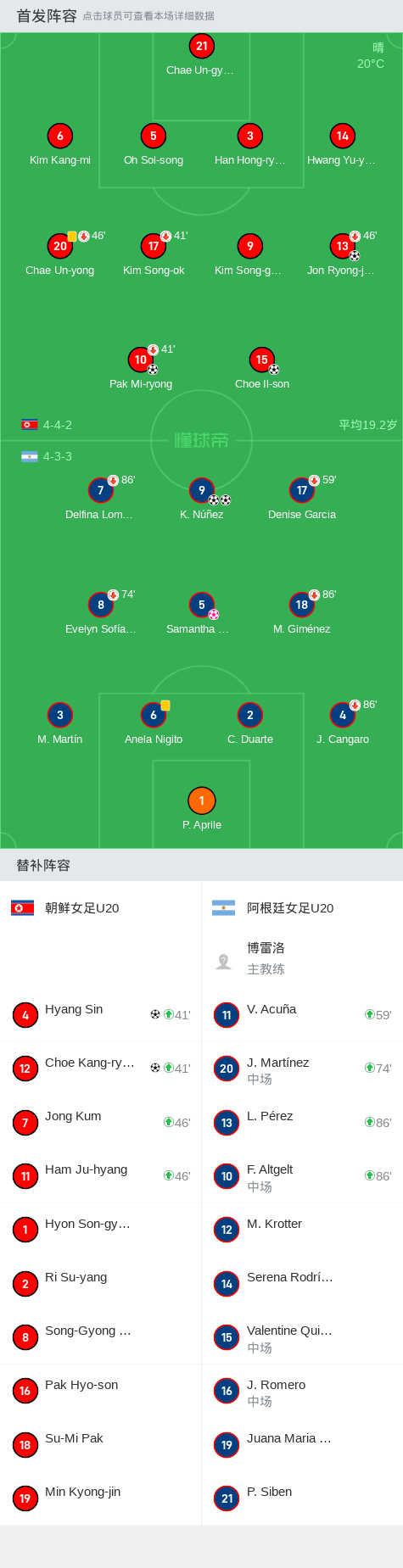 在U20女子足球世界杯小组赛的首轮比赛中,朝鲜女足U20迎战阿根廷女足U20。比赛中,朝鲜女足U20的Pak Mi-ryong率先破门,随后Jon Ryong-jong再下一城。上半场补时阶段,阿根廷女足U20的Samantha Weiss不慎自摆乌龙,但K. Núñez迅速为阿根廷女足U20扳回一球。 下半场,朝鲜女足U20的Hyang Sin继续扩大比分,Choe Il-son也贡献了一粒进球。尽管阿根廷女足U20的K. Núñez再次破门,但朝鲜女足U20的Choe Kang-ryon在比赛尾声阶段锁定胜局。最终,朝鲜女足U20以6-2战胜阿根廷女足U20,取得了本场比赛的胜利。