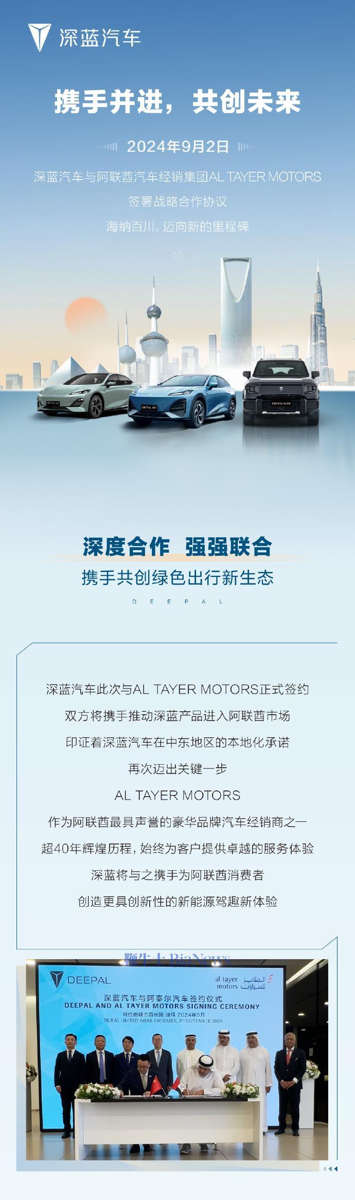 鞭牛士 9月3日消息,据深蓝汽车消息,深蓝汽车昨日与阿联酋汽车经销集团AL TAYER MOTORS签署战略合作协议,双方将共同推动深蓝产品进入阿联酋市场。