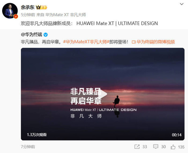 9月3日,CNMO注意到,华为常务董事、终端BG董事长、智能汽车解决方案BU董事长余承东正式官宣华为旗下首款三折叠屏手机,也是非凡大师品牌新成员:HUAWEI Mate XT | ULTIMATE DESIGN。