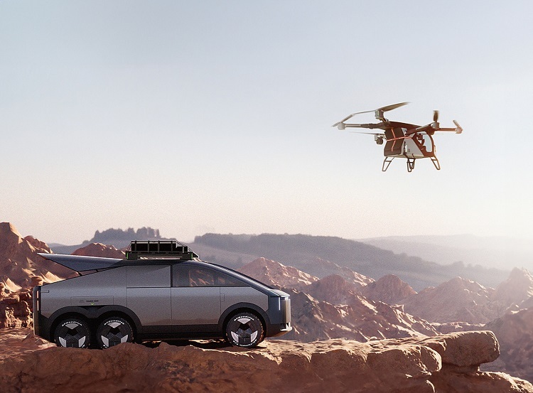整个陆行体有4个车门,后备箱的部分被改装成存放飞行体的舱室,因此它从外观上看更像是一台大号的MPV。并且,为了承载飞行体巨大的重量,陆行体拥有6X6的全轮驱动,还带有后轮转向。同时,新车采用增程式动力系统,能给飞行体持续补能。