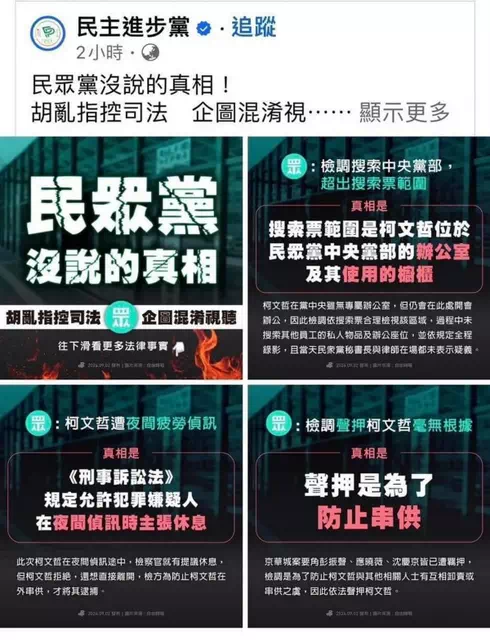 民进党2日在脸书发文为北检说明京华城案,遭质疑后紧急删文。(照片:民进党脸书)