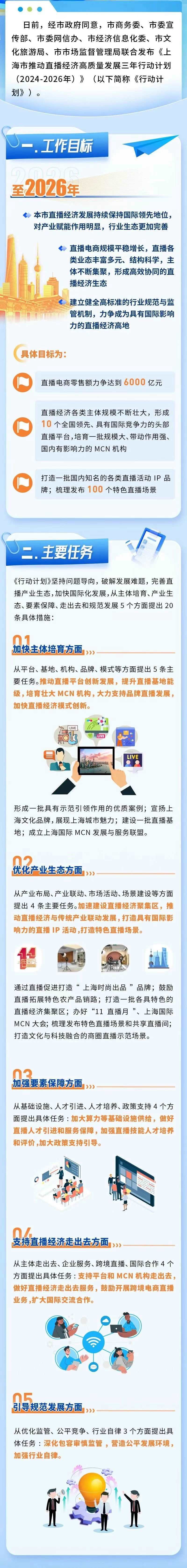 东方网记者从《行动计划》中了解到,到2026年,上海直播电商零售额力争达到6000亿元,直播经济各类主体规模不断壮大,形成10个全国领先、具有国际竞争力的头部直播平台,培育一批规模大、带动作用强、国内有影响力的主播服务机构(以下简称MCN机构),打造一批国内知名的各类直播活动IP品牌,梳理发布100个特色直播场景。