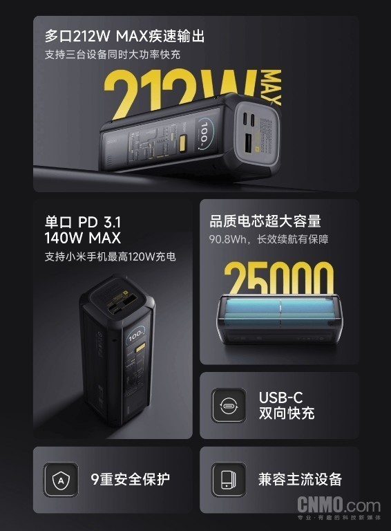 小米充电宝25000 212W配备了两个USB-C接口和一个USB-A接口,支持PD 3.1充电标准,单个接口的最大输出功率可达140W,适用于小米手机的120W快速充电。此外,这款充电宝能够同时为三台设备提供充电,最大充电功率分别为65W、27W和120W。在双口同时充电的情况下,总功率可以达到65W+120W。