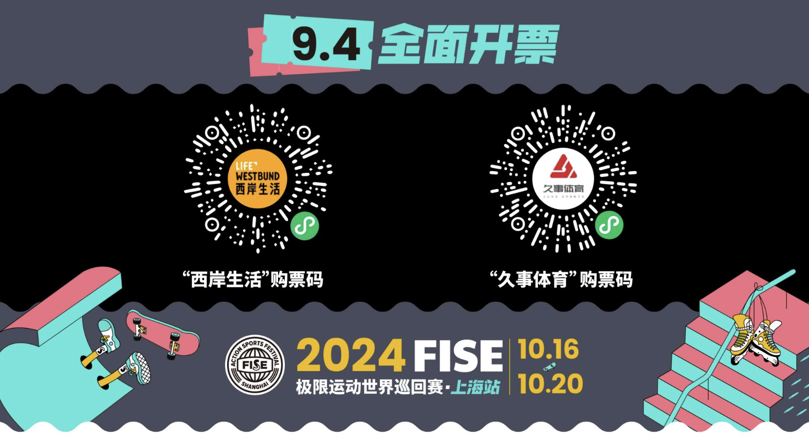 本次赛事在国际自行车联盟、世界轮滑联合会、世界体育舞蹈联合会的指导下,由中国自行车运动协会、中国体育舞蹈联合会、上海市体育局、上海市徐汇区人民政府共同主办,上海市徐汇区体育局、西岸集团、法国飓风集团承办。赛事及嘉年华全场通票已于9月4日开售限量早鸟,观众可登陆“久事体育”App或“西岸生活”微信小程序抢购,使用工商银行信用卡(上海地区发行)微信支付享25元立减优惠。