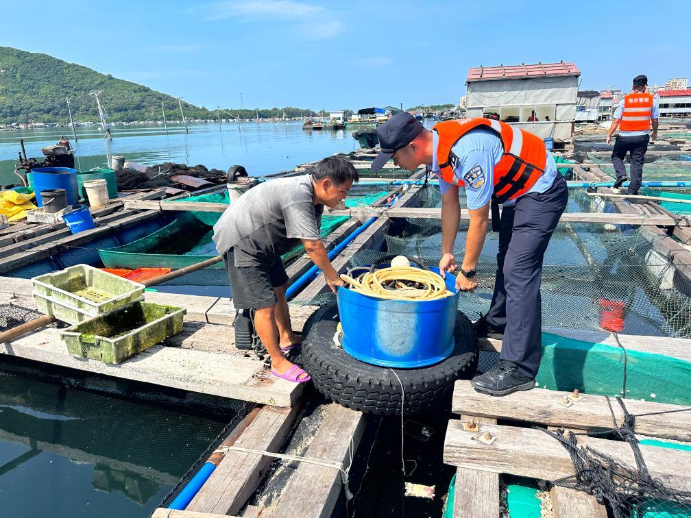 4日,陵水黎族自治县公安局新村港海岸派出所民警协助渔民加固渔排渔具。(新华社发 朱照洁 摄)