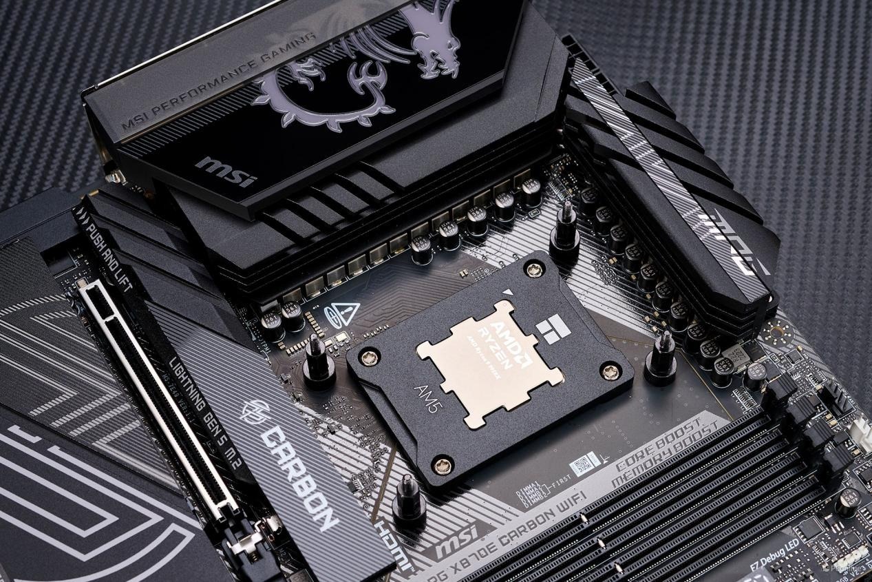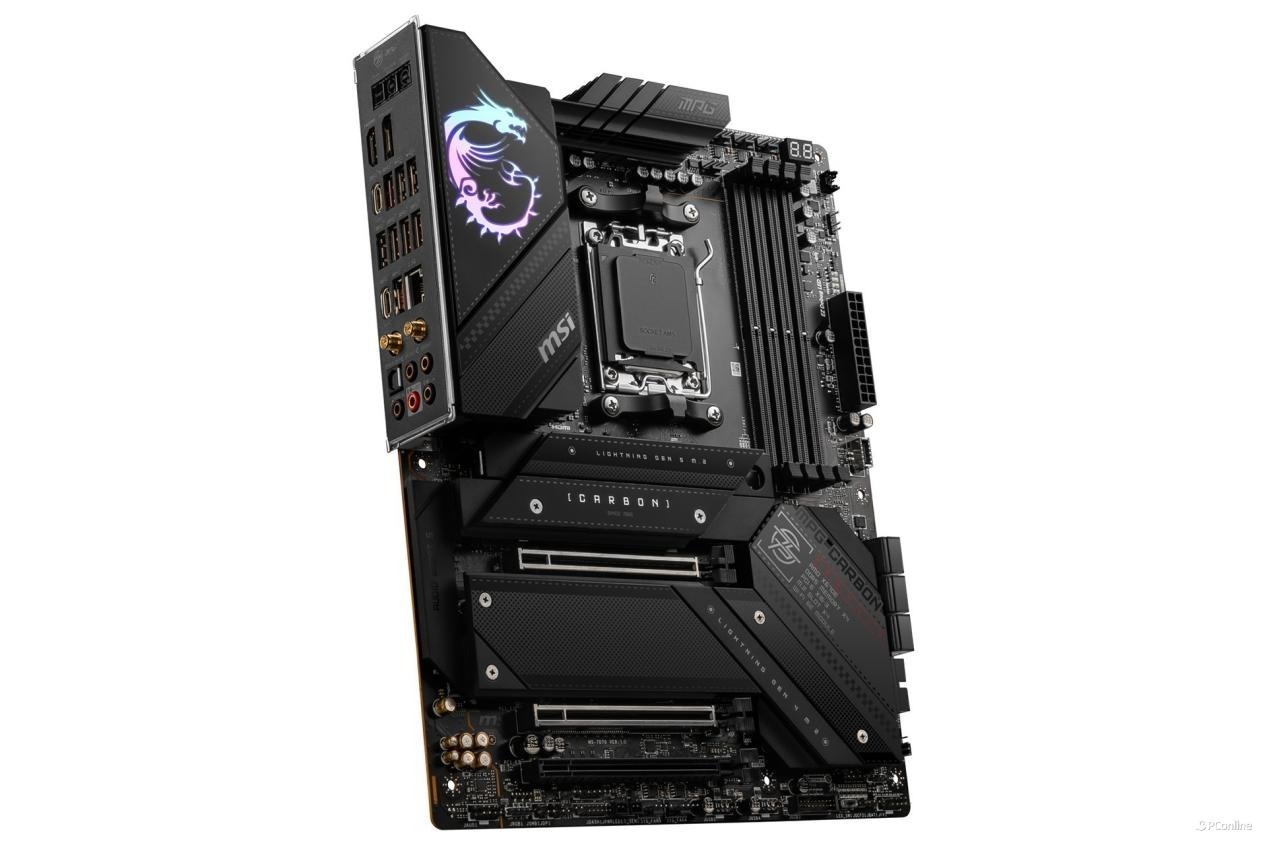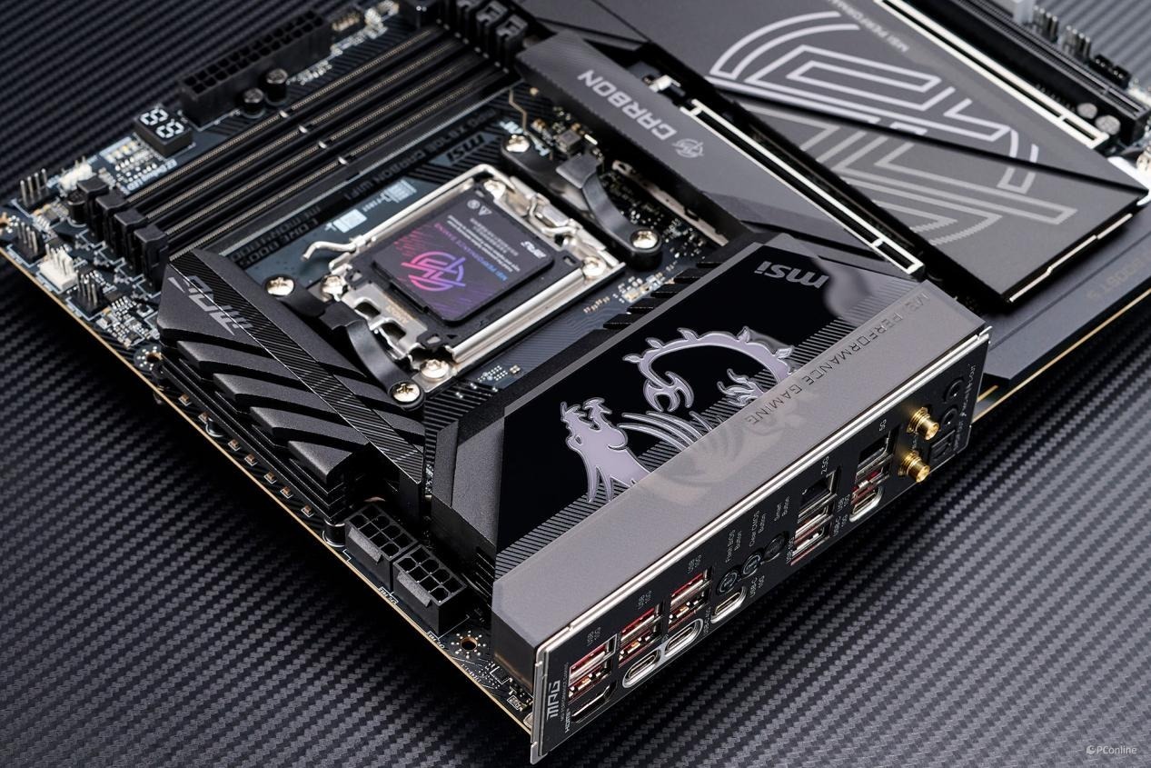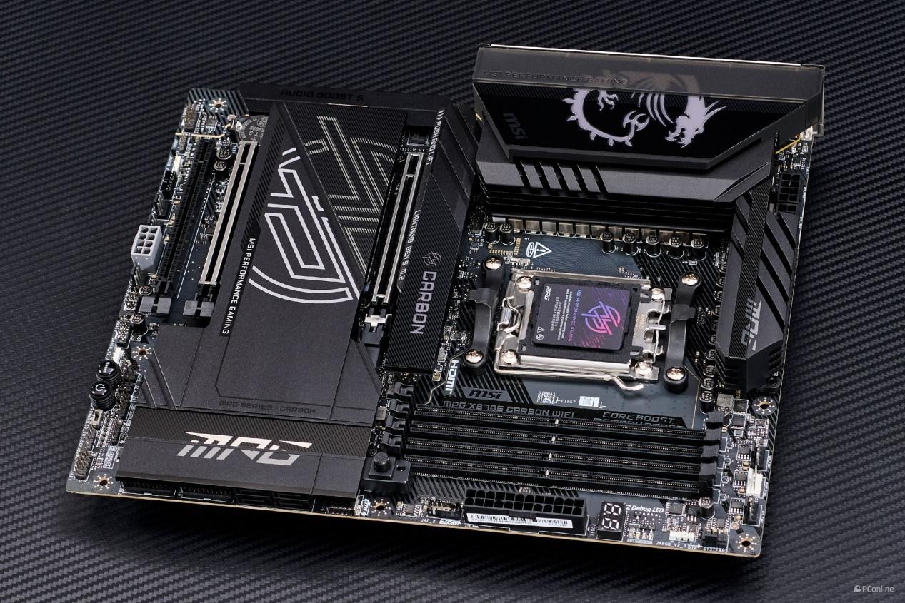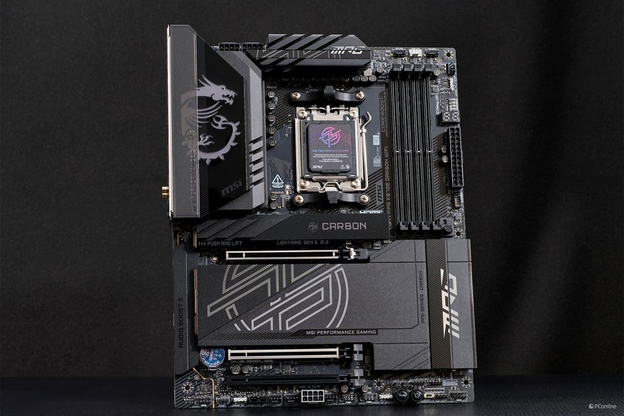 当然想要发挥出锐龙9000系列处理器的极致性能,旗舰级的X870E芯片组一定少不了。 微星首发阵容包括MEG X870 GODLIKE超神、MPG X870E CARBON WIFI暗黑、MAG X870 TOMAHAWK WIFI战斧导弹以及PRO X870-P WIFI四款,而首轮送测的是之前已经曝光过的微星MPG X870E CARBON WIFI暗黑主板。