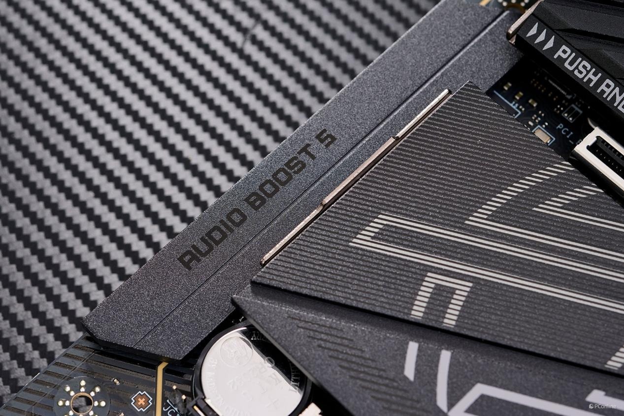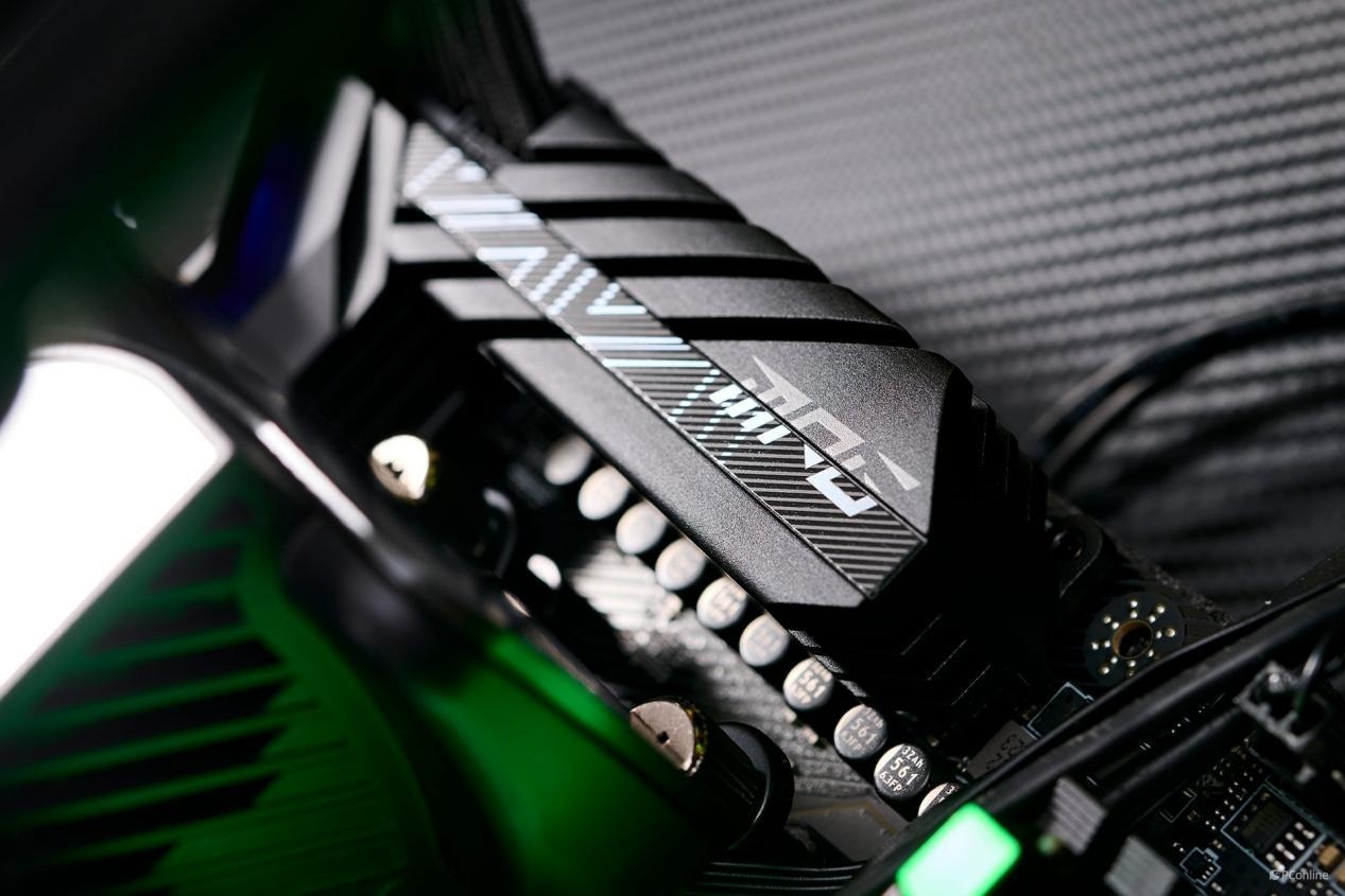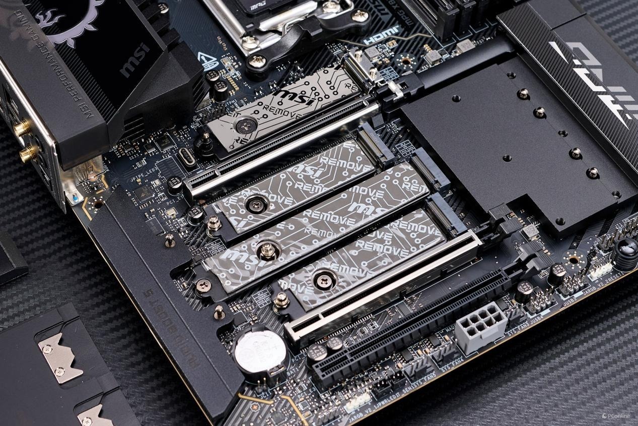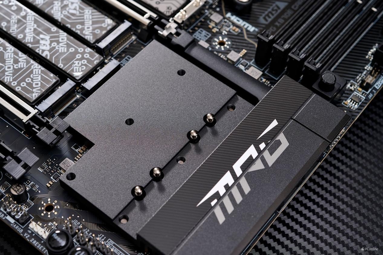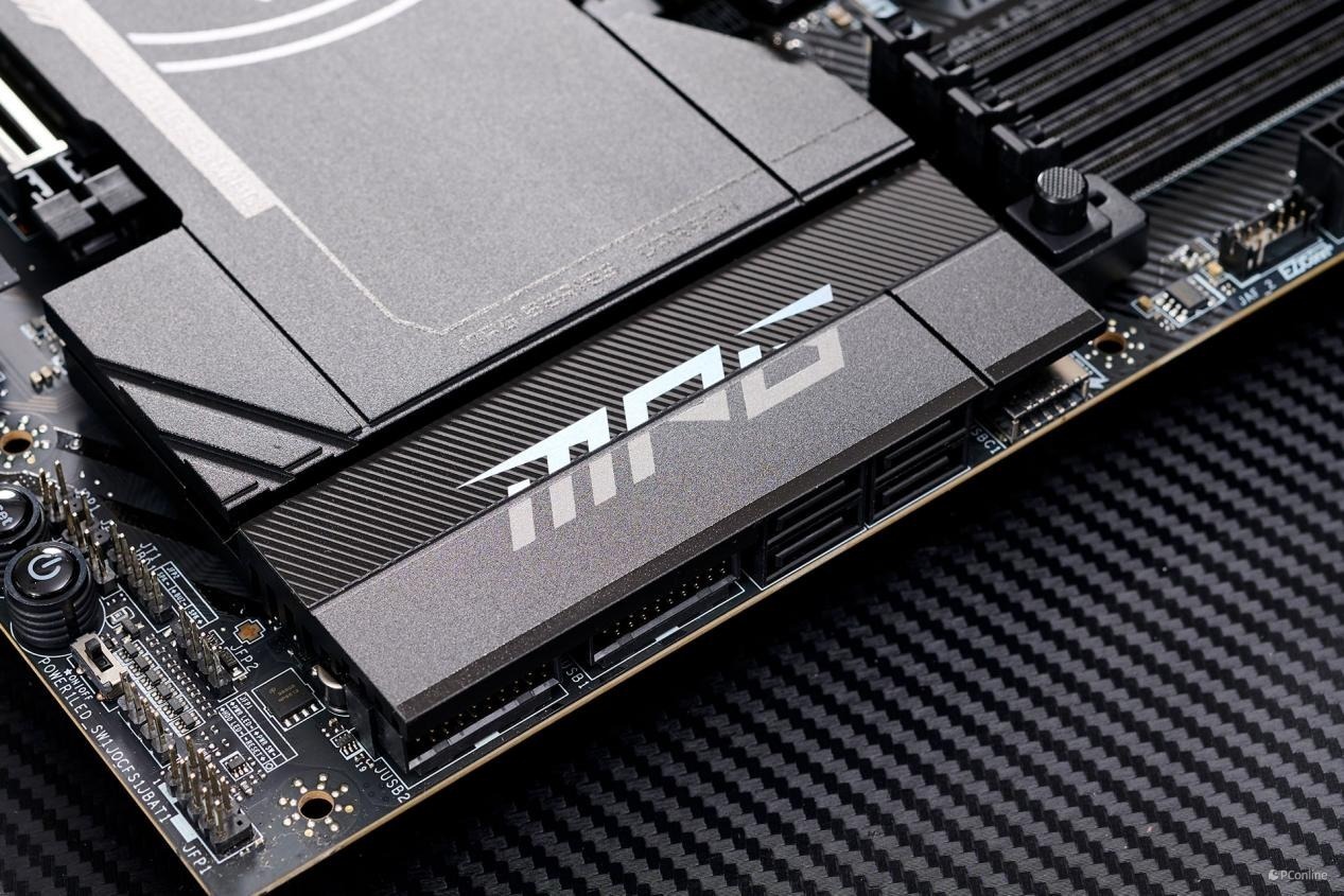 M.2散热马甲的面积已经把主板一半给覆盖上了,而上方的GEN 5 M.2固态硬盘则是单独的散热马甲,两者均带上7W/mk高效能导热贴。