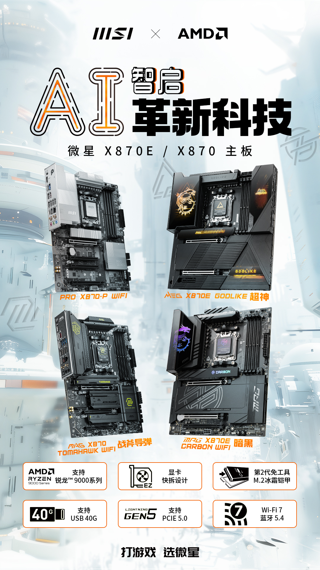 AMD X870E芯片组支持AMD 锐龙™ 9000/800/7000系列台式处理器,支持最先进的DDR5 内存,以及支持兼具 AMD PBO 和 MSI 主板BIOS手动超频,可兼容单核心和多核心应用的效能,满足追求最大效能使用者需求。