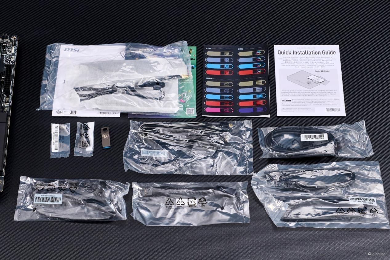 我们拿到的是测试样品,里面包括:快速安装手册、Eur环保说明书、产品注册手册、微星贴纸、驱动U盘、M.2安装螺丝、内六角拆装锁匙、两条SATA线、前置面板IO延长线、EZConn转换线、ARGB转换线,以及+12V RGB一分二线材等。
