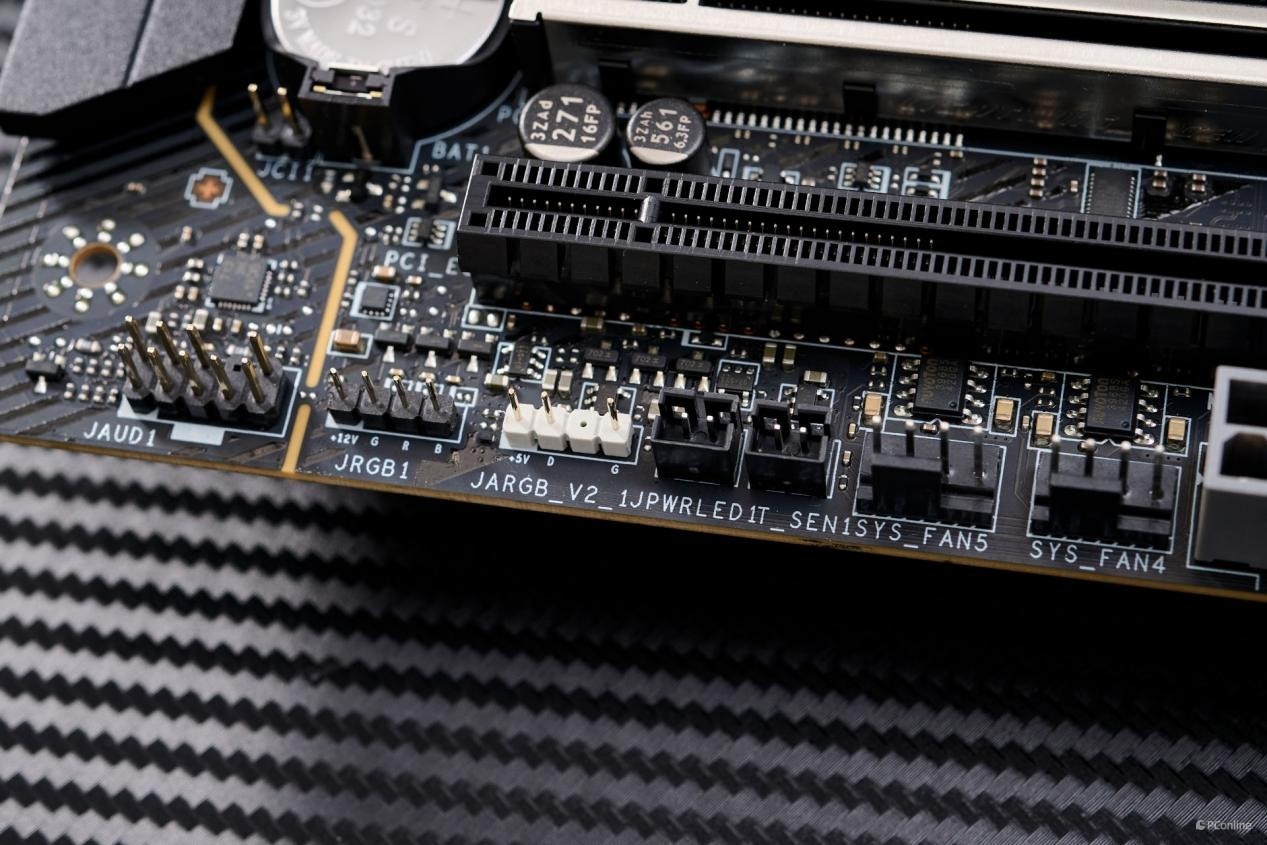 左侧底部同样是相关的扩展接口,这里我们统计一下:一个前置面板控制接口(JFP1)、JBAT1清除BIOS接线、LED开关、两个AGRB接口、两组USB接口、三个风扇PWM接口、一个+12V RGB接口,以及前置音频接口(JAUD1)。