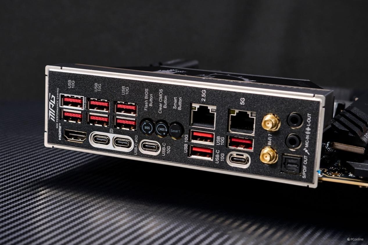 微星MPG X870E CARBON WIFI暗黑主板IO挡板那是相当的丰富,甚至比别家的旗舰级产品都要强,包括:9*USB 10Gbps Type-A(红色)、1*HDMI 2.1(8k60Hz)、2个USB 40Gbps Type-C、2*USB 10Gbps Type-C、Flash BlOS Button、Clear CMOS Button、Smart Button、2.5G有线网络接口、5G有线网络接口、WiFi 7天线,以及音频输出接口。