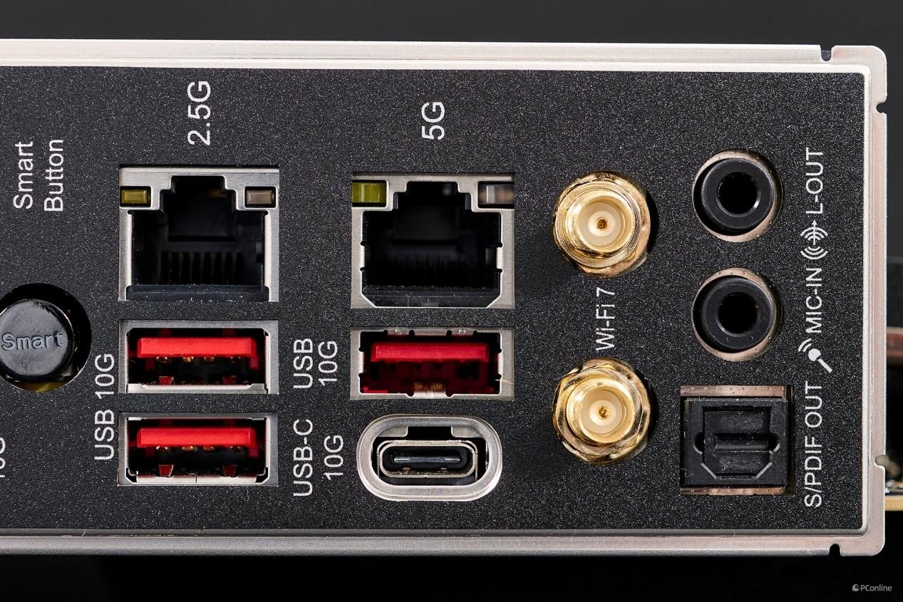 配合上两个Gen5 M.2插槽、两个Gen4 M.2插槽、两个Lightning USB 40G、无线Wi-Fi 7,以及5G+2.5G双有线网卡,扩展性能丰富程度已经把同级主板都要比下去。