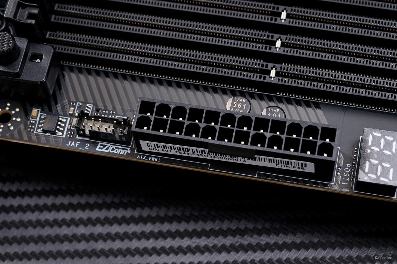 主板24Pin供电接口旁的较为特别的EZ Conn接口(JAF_2接口),一个集成度较高的扩展座,可由转换线扩展成ARGB接口、4Pin PWM风扇掊,以及一个USB接口。