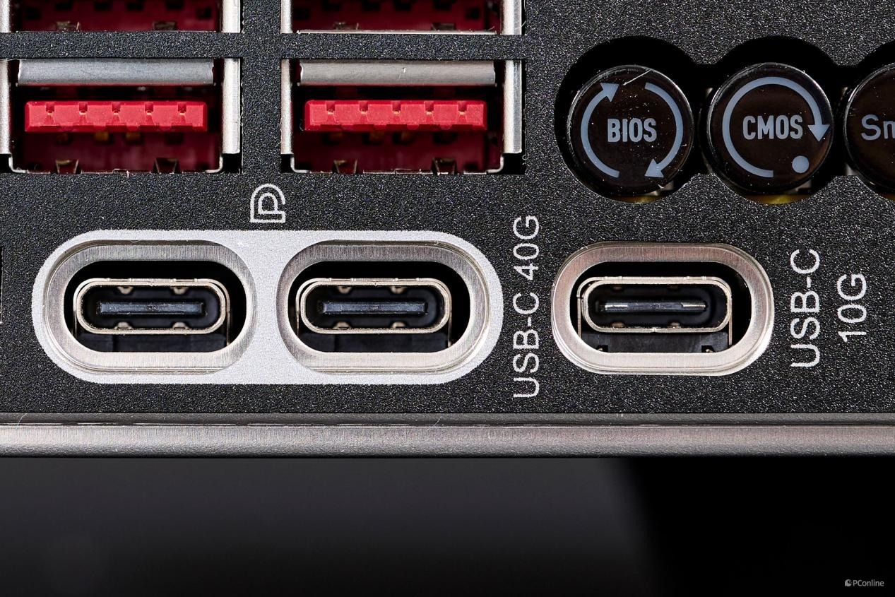 两个USB-C 40接口,带DP 1.4a显示输出,但需要处理器集成核心显卡。这两个接口由祥硕ASM4242芯片提供,上行端口可达到PCIe 4.0 x4带宽,而且此芯片已经获得雷电4认证,是全球少数的USB4与雷电4双认证的主控芯片。