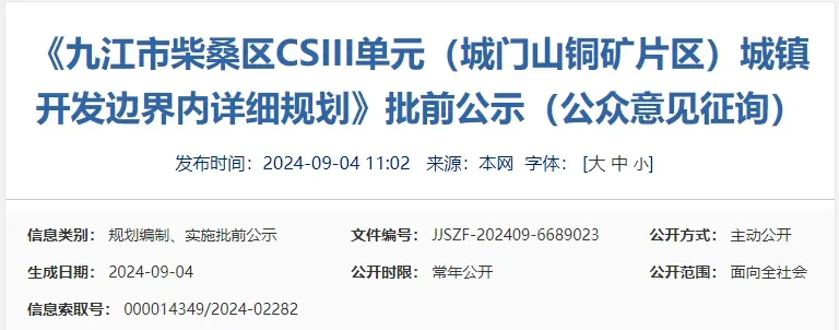 《九江市柴桑区CSIII单元(城门山铜矿片区)城镇开发边界内详细规划》批前公示(公众意见征询)