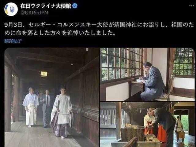 当天,乌克兰驻日本大使馆在社交媒体上发布图文,公然宣传科森斯基参拜日本靖国神社的行为,还将其错误地称为“瞻仰为国捐躯的烈士”。