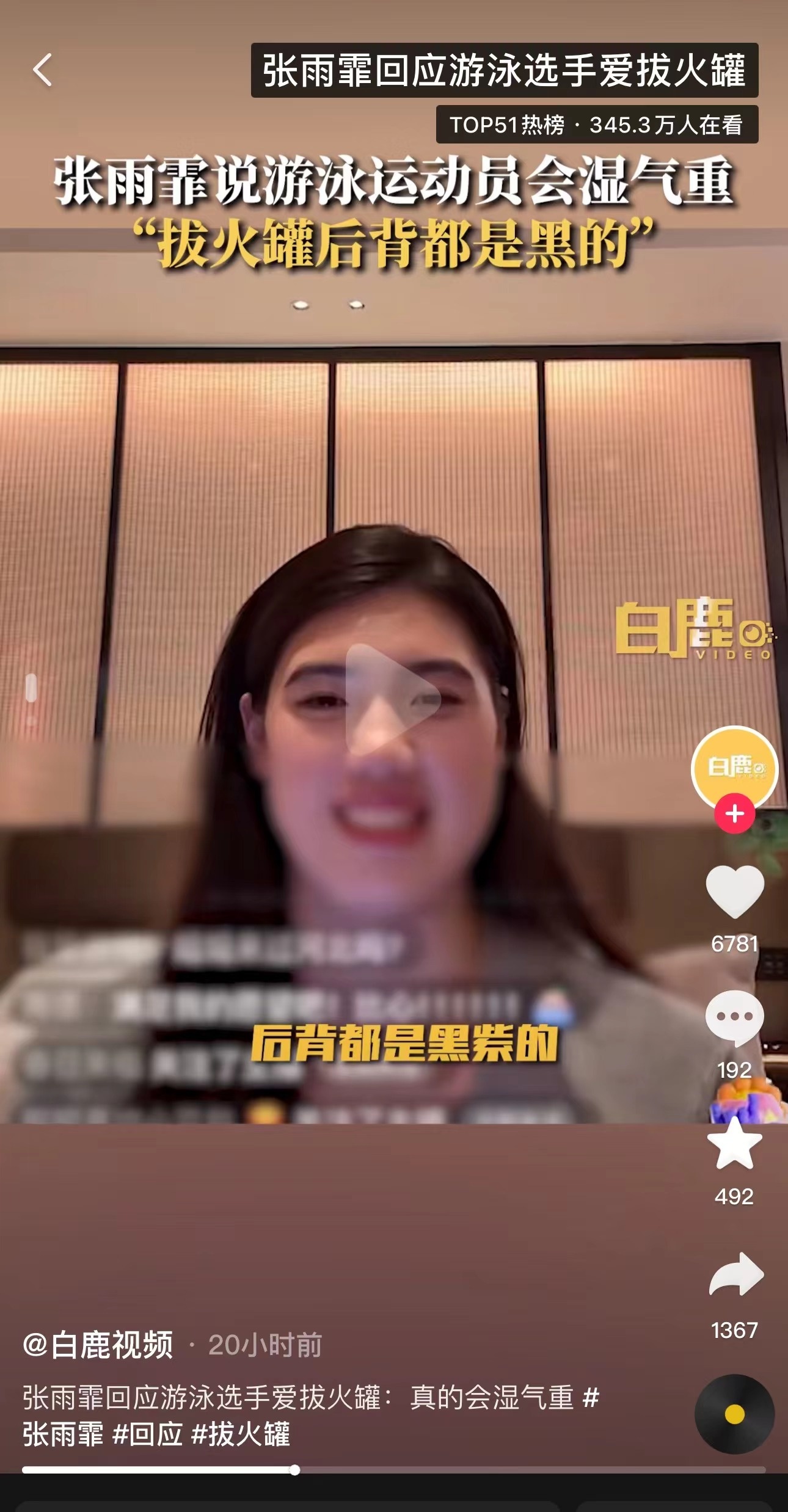 张雨霏直播谈拔火罐。图/白鹿视频