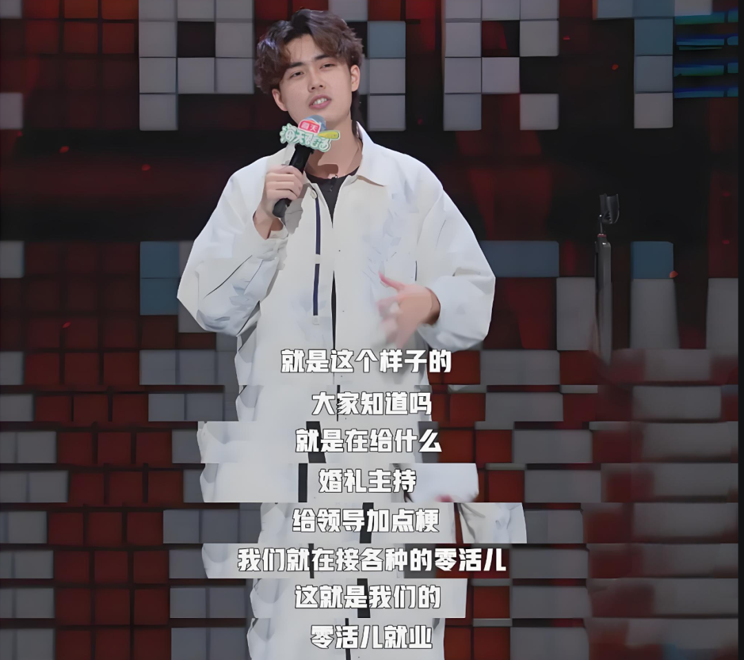 比如江梓浩,这位在《脱口秀大会》刚崭露头角的哥们,现在只能接接婚礼主持、给领导讲话稿加梗的零活儿,自嘲是“零活儿就业”。