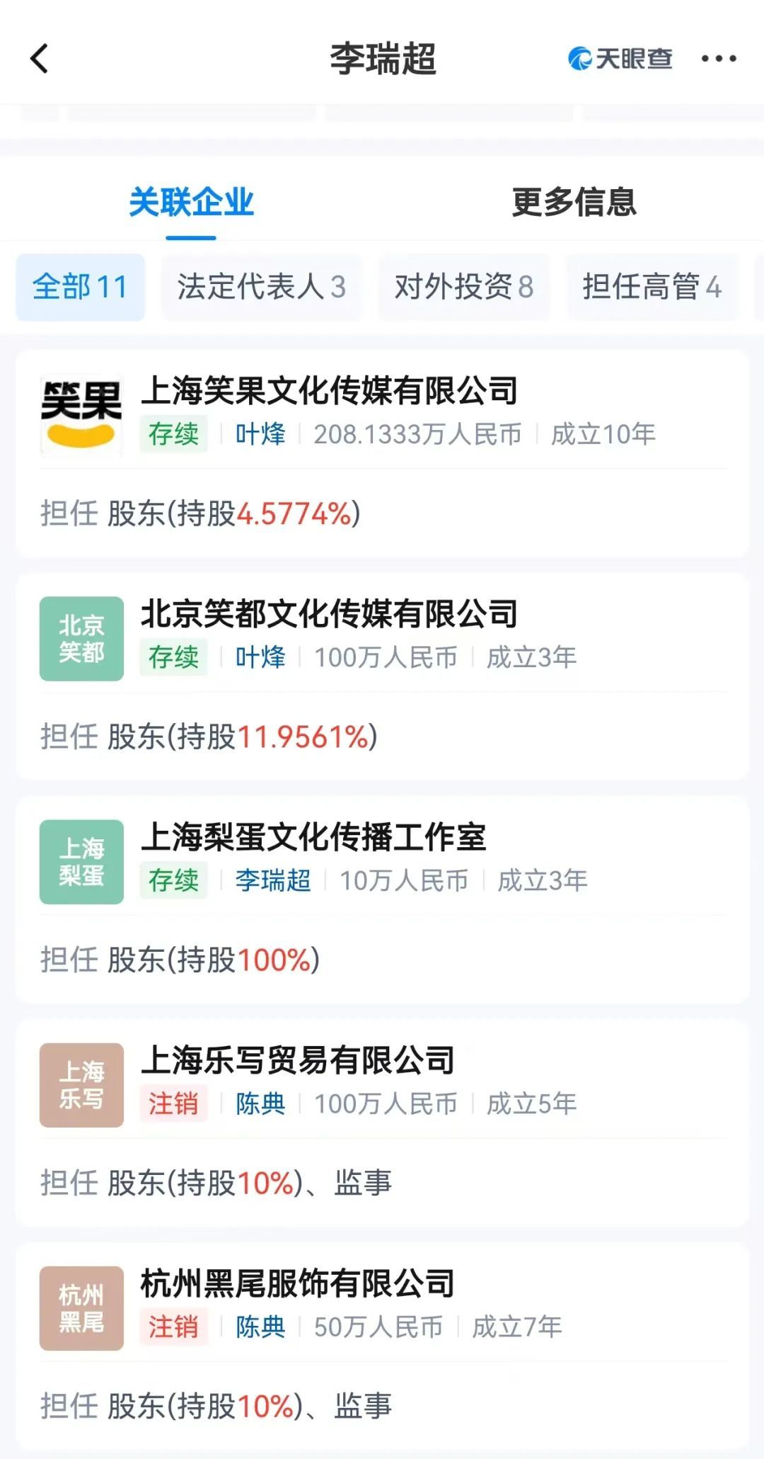 天眼查显示,截至目前,李诞(李瑞超)名下关联11家企业,仅剩3家为存续状态。其中,今年2月,上海梨蛋文化传播工作室,经营范围新增:个人互联网直播服务、互联网销售、数字内容制作服务等。
