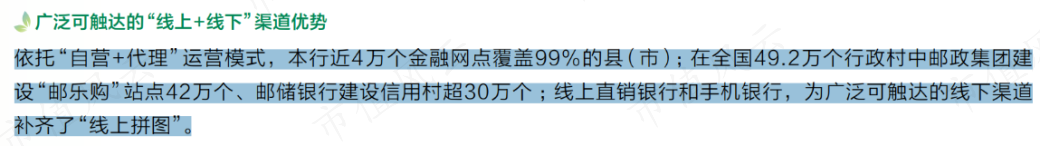 在这方面,邮储银行有着天然的资源禀赋优势。依托邮政体系遍布全国、深入乡村的营业网点,邮储确立“自营+代理”的业务模式,拥有近4万个网点,覆盖99%的县(市),在网点数量和下沉深度上稳居国有大行前列。