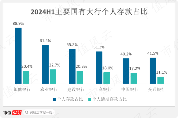 今年上半年,邮储银行的个人存款占比达到88.9%,位居国有大行之首,个人活期存款占比也排在同业前列。