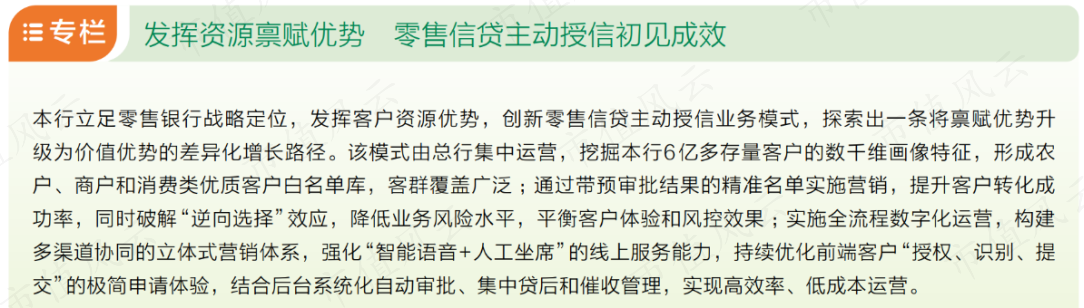 另一方面,创新探索主动授信模式,这也成为零售贷款业务赢得增量的“法宝”。2024年上半年,主动授信新增客户超120万户,贷款余额超2,400亿元,不良贷款率控制在0.5%以内,业务增速和风控质量均达到行业领先水准。