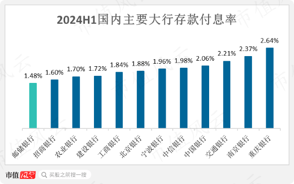 数量庞大、占比更高的个人存款则为邮储银行带来了极低的负债成本。今年上半年,邮储银行的存款平均付息率为1.48%,处于国有六大行最低水平。与其他中大型银行相比,邮储的成本优势依旧遥遥领先,这也是其净息差保持优势的关键。