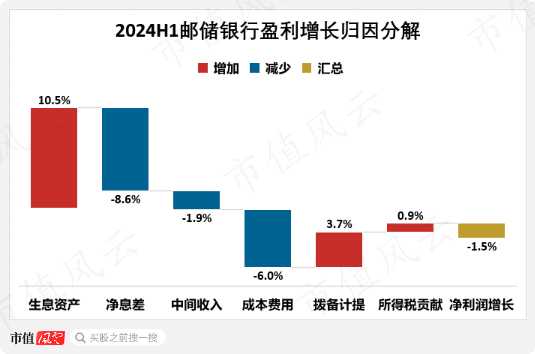 进一步对邮储银行的盈利增长驱动因素进行拆解,我们会发现其盈利增长的正向贡献项主要是生息资产扩张,拖累项主要是净息差下降及成本费用增长。