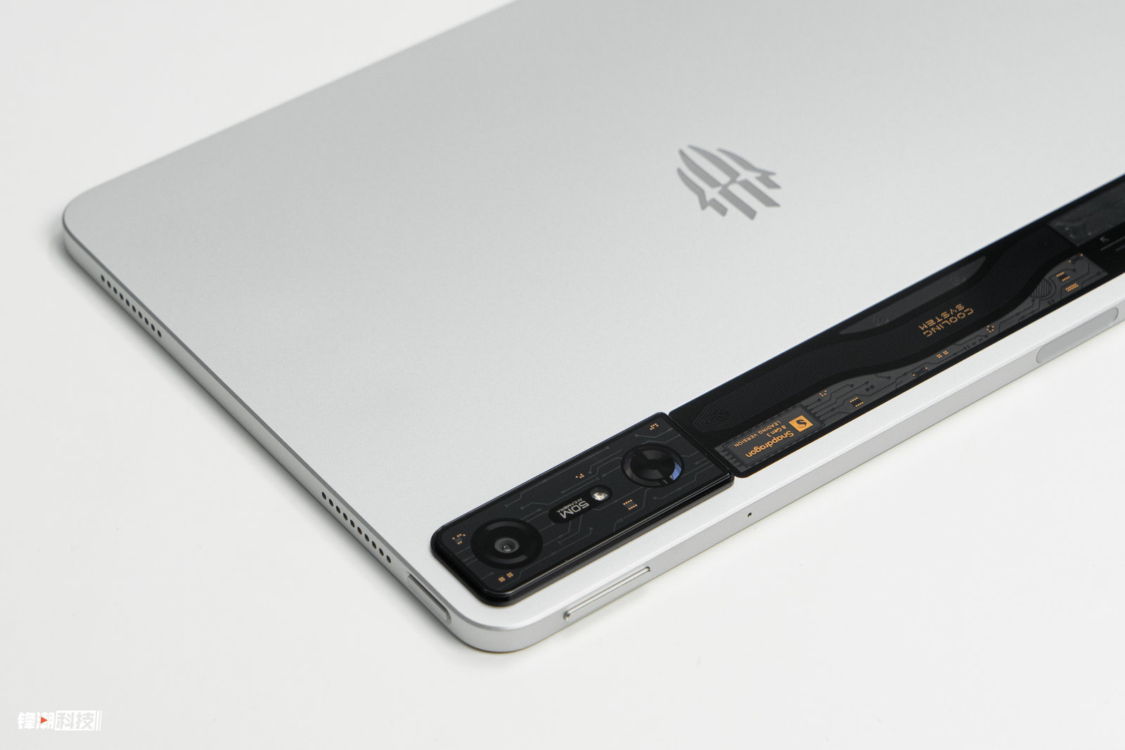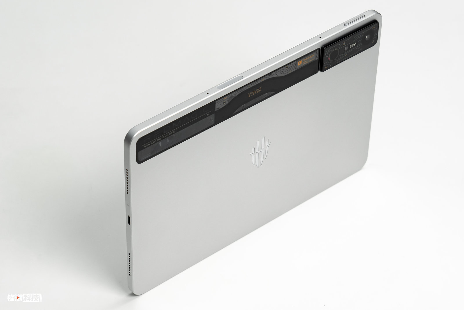 红魔电竞平板Pro的一大亮点就是机身背面的透明设计,透明部分采用镜头级铝硅玻璃覆盖,能够看到内部3D热管和刻蚀电路装饰板,配合RGB风扇灯,整体看起来十分酷炫。